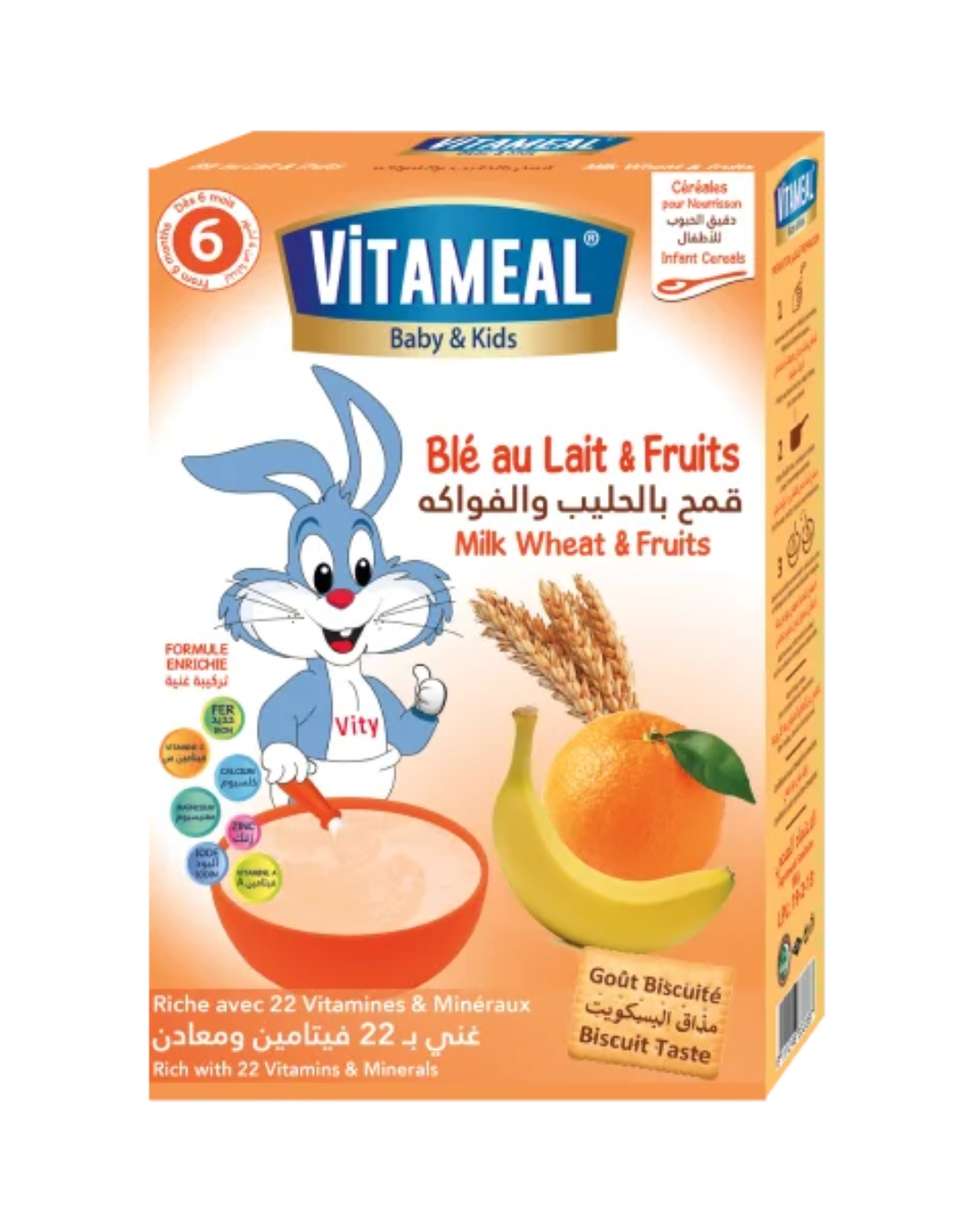 Les céréales blé lait fruits Vitameal Baby sont une préparation au lait composée de blé et d’un mélange de fruits : oranges, bananes et dattes. Cette combinaison apporte une saveur naturellement douce et une texture adaptée à l’alimentation des tout-petits.